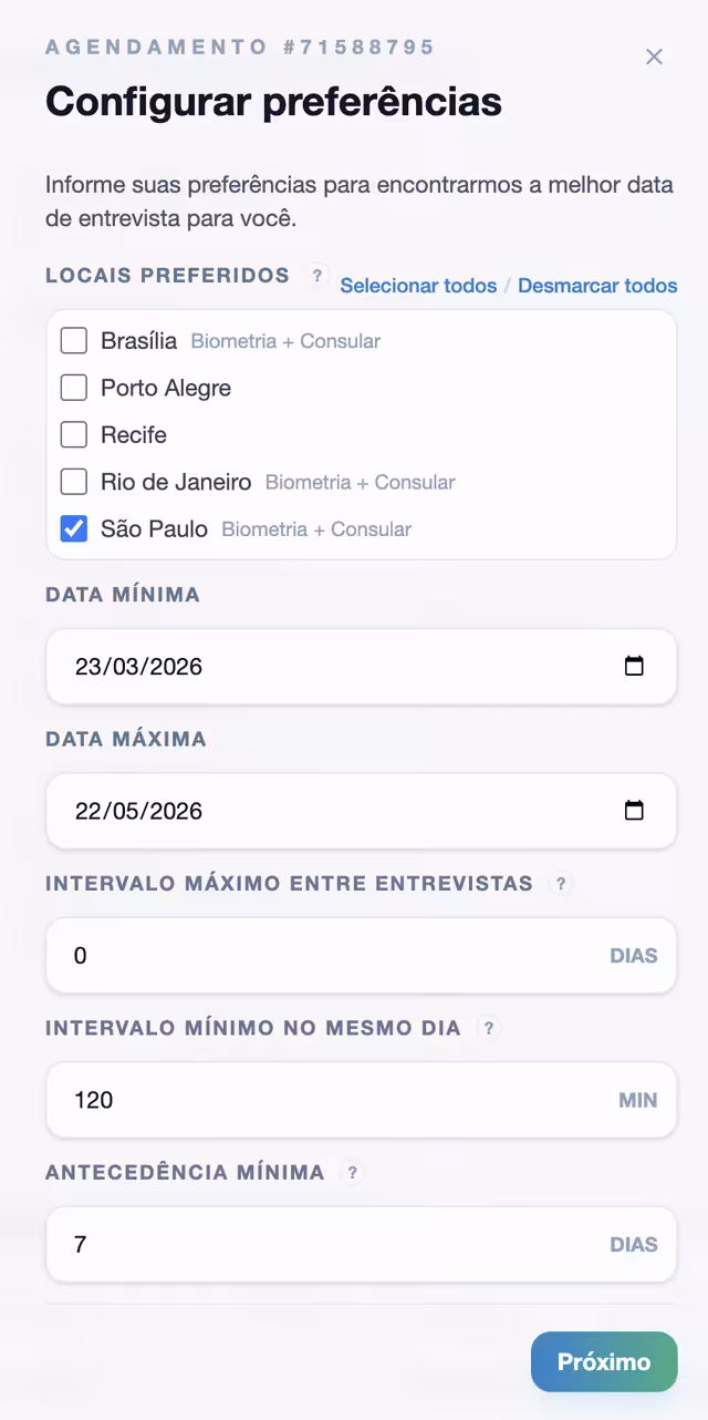 Consiga uma nova data em poucos dias. Monitoramos o portal oficial 24h e agendamos automaticamente quando surge uma vaga dentro das suas preferências.